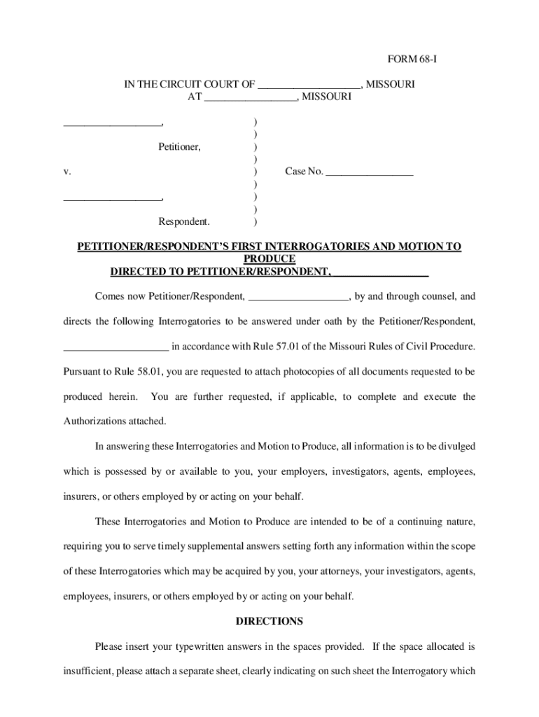 FORM 68I IN THE CIRCUIT COURT OF ___, MISSOURI AT ___, MISSOURI ___, Petitioner, v. ___, Respondent.) ))))))))Case No. ___PETITIONER/RESPONDENTS FIRST INTERROGATORIES AND MOTION TO PRODUCE DIRECTED