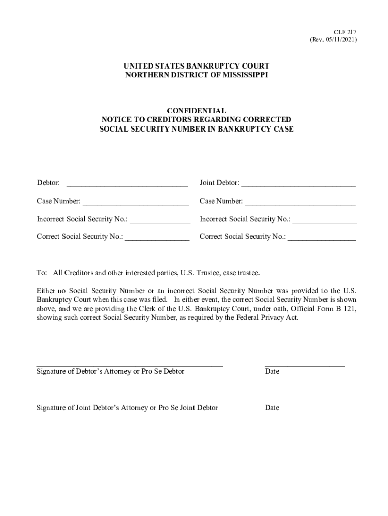 CF 217 (Rev. 05/11/2021)UNITED STATES BANKRUPTCY COURT NORTHERN DISTRICT OF MISSISSIPPICONFIDENTIAL NOTICE TO CREDITORS REGARDING CORRECTED SOCIAL SECURITY NUMBER IN BANKRUPTCY CASEDebtor: ___Joint