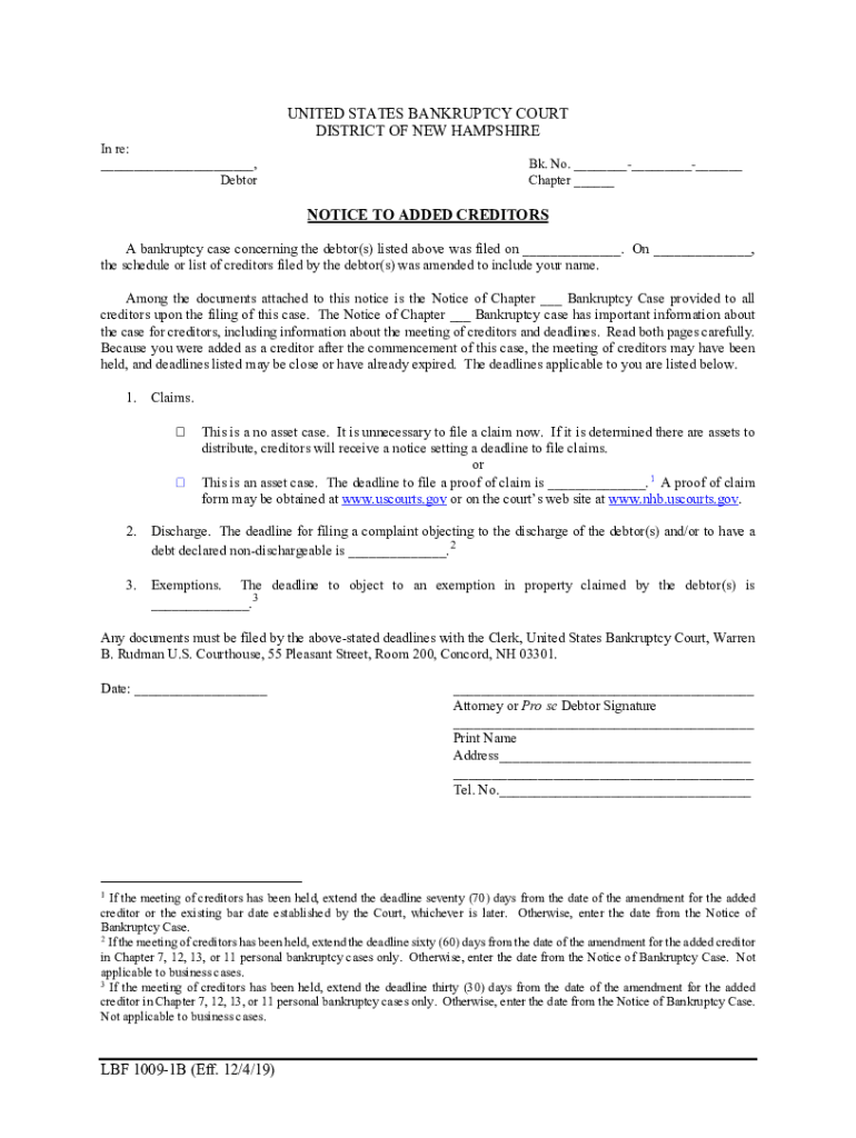 In re: ___, DebtorUNITED STATES BANKRUPTCY COURT DISTRICT OF NEW HAMPSHIRE Bk. No. _________ Chapter ___NOTICE TO ADDED CREDITORS A bankruptcy case concerning the debtor(s) listed above was filed