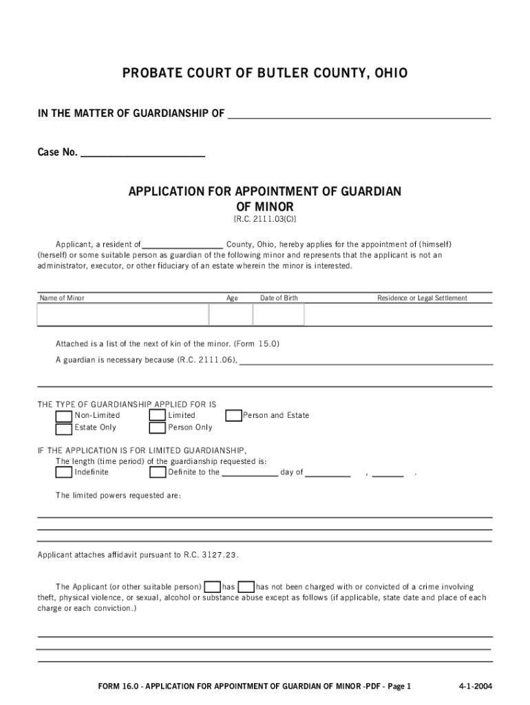 PROBATE COURT OF BUTLER COUNTY, OHIO IN THE MATTER OF GUARDIANSHIP OF Case No. APPLICATION FOR APPOINTMENT OF GUARDIAN OF MINOR [R.C. 2111.03(C)] Applicant, a resident of County, Ohio, hereby applies