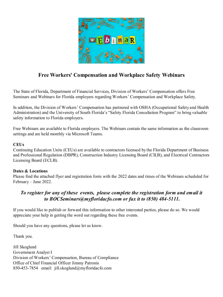 Free Workers\' Compensation and Workplace Safety Webinars The State of Florida, Department of Financial Services, Division of Workers Compensation offers Free Seminars and Webinars for Florida employers