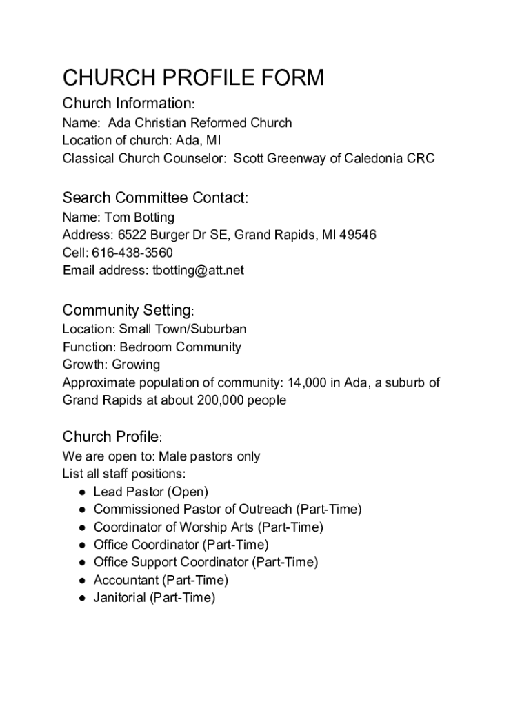 CHURCH PROFILE FORM Church Information: Name: Ada Christian Reformed Church Location of church: Ada, MI Classical Church Counselor: Scott Greenway of Caledonia Research Committee Contact: Name: Tom