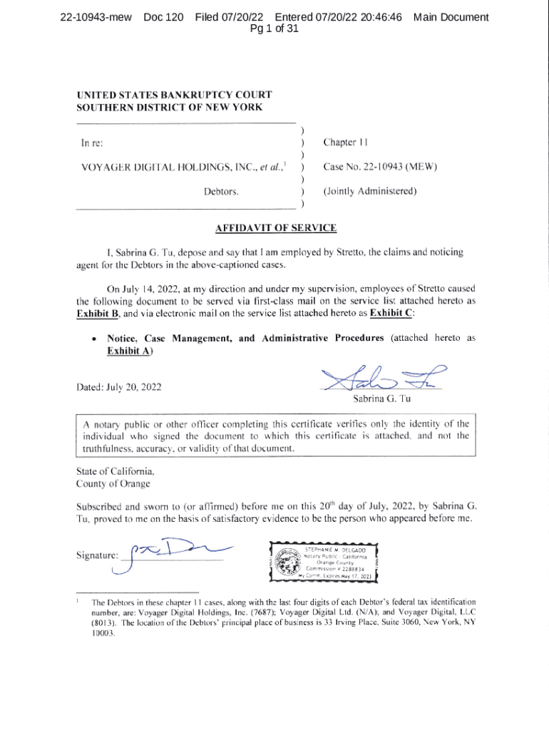 2210943mewDoc 120Filed 07/20/22 Entered 07/20/22 20:46:46 Pg 1 of 31Main DocumentTINITED STATE, S BANK RT]PTC COURT SOUTHERN DISTRICT OF NEW YORK)In re:)Chapter II)VOYAGER DIGITAL HOLDINGS, UNC.,