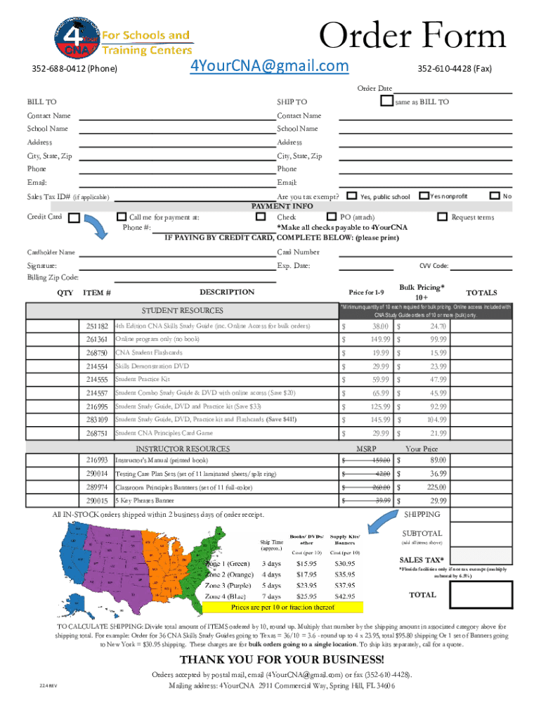 To fill out order form 4yourcna, you need to provide your contact information, shipping address, and the materials you need.
