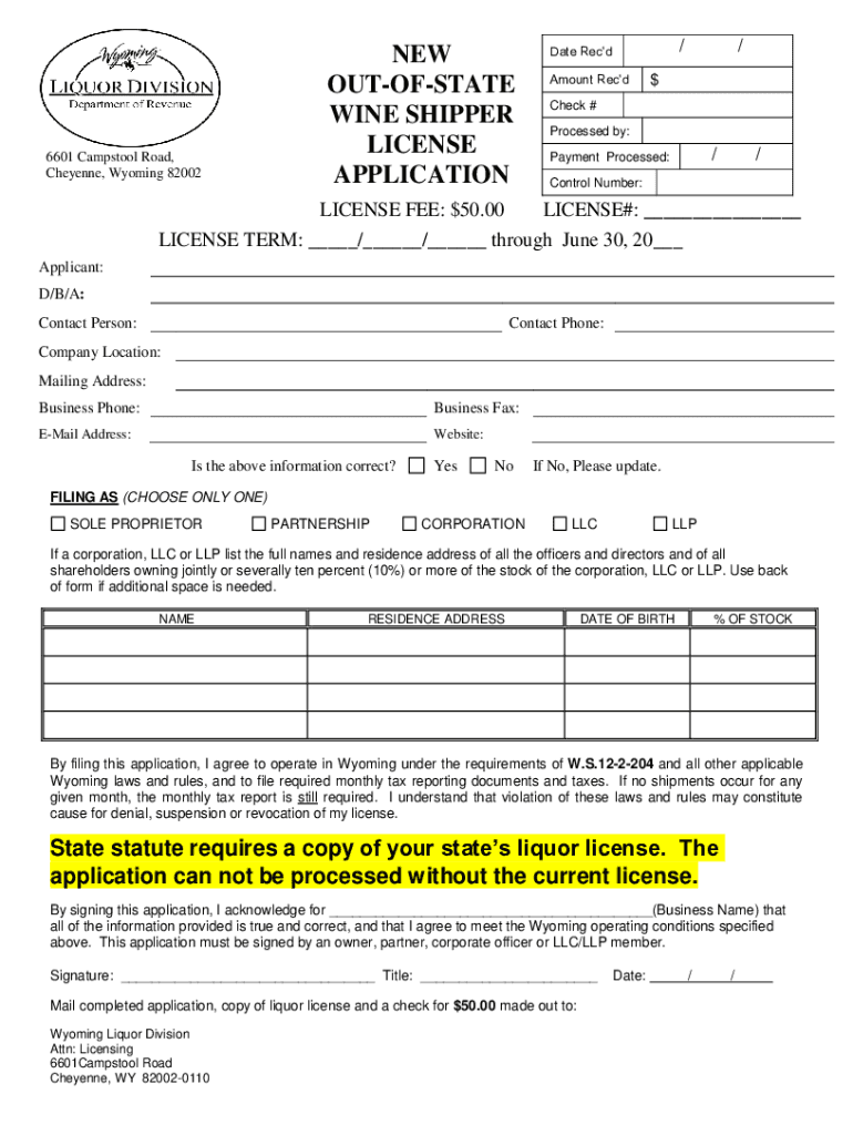 6601 Camp stool Road, Cheyenne, Wyoming 82002NEW OUTOFSTATE WINE SHIPPER LICENSE APPLICATION/Date Recd Amount Recd/check # Processed by:/Payment Processed:/Control Number:LICENSE FEE: $50.00 LICENSE#: