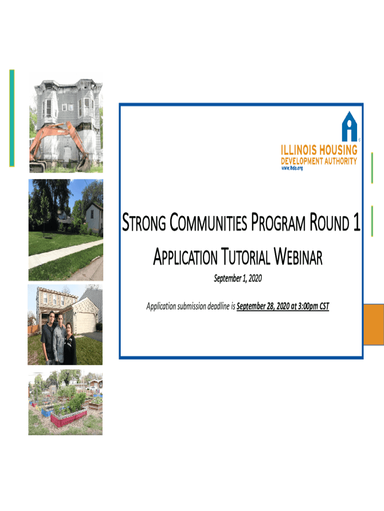 STRONG COMMUNITIES PROGRAM ROUND 1 APPLICATION TUTORIAL WEBINAR September1,2020 ApplicationsubmissiondeadlineisSeptember28,2020at3:00pmCSTSTRONG COMMUNITIES PROGRAM ESTABLISHMENT AND BACKGROUND EstablishedbyRebuildIllinoiscapitalplan(fundedthroughBuildIllinoisBonds)$10millionavailableforthisround,IHDAanticipatesthreeroundsofthisProgramThepurposeoftheProgramistousefundingfromtheBuildIllinoisBondFundto