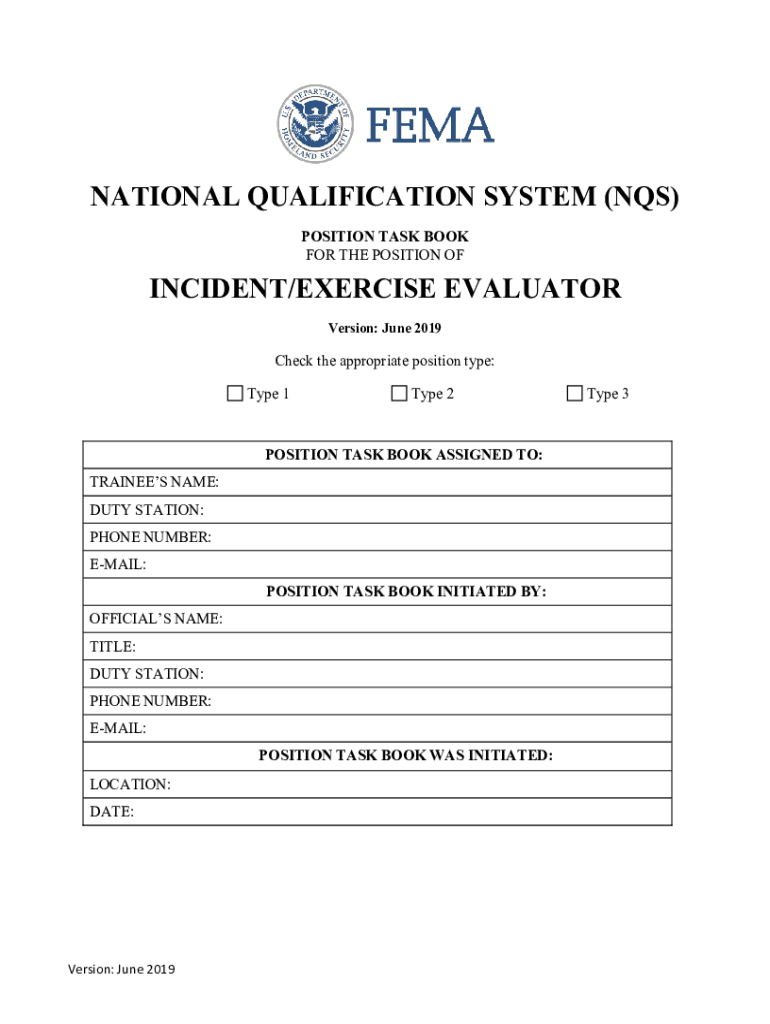 NATIONAL QUALIFICATION SYSTEM (NHS) POSITION TASK BOOK FOR THE POSITION INCIDENT/EXERCISE EVALUATOR Version: June 2019Check the appropriate position type: Type 1Type 2POSITION TASK BOOK ASSIGNED TO: