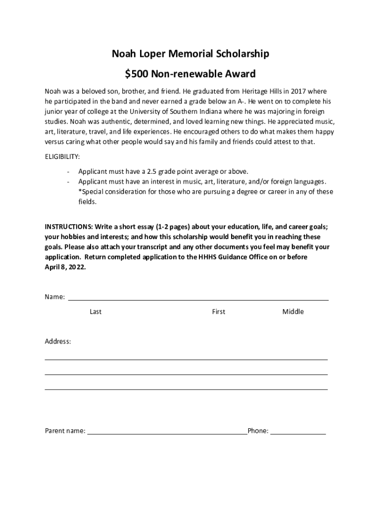 Noah Lower Memorial Scholarship $500 Nonrenewable Award Noah was a beloved son, brother, and friend. He graduated from Heritage Hills in 2017 where he participated in the band and never earned a grade