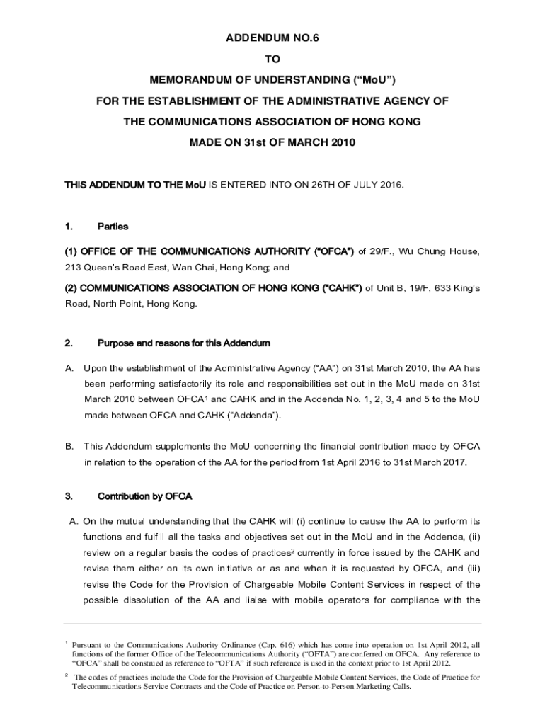 ADDENDUM NO.6 TO MEMORANDUM OF UNDERSTANDING (You) FOR THE ESTABLISHMENT OF THE ADMINISTRATIVE AGENCY OF THE COMMUNICATIONS ASSOCIATION OF HONG KONG MADE ON 31st OF MARCH 2010THIS ADDENDUM TO THE