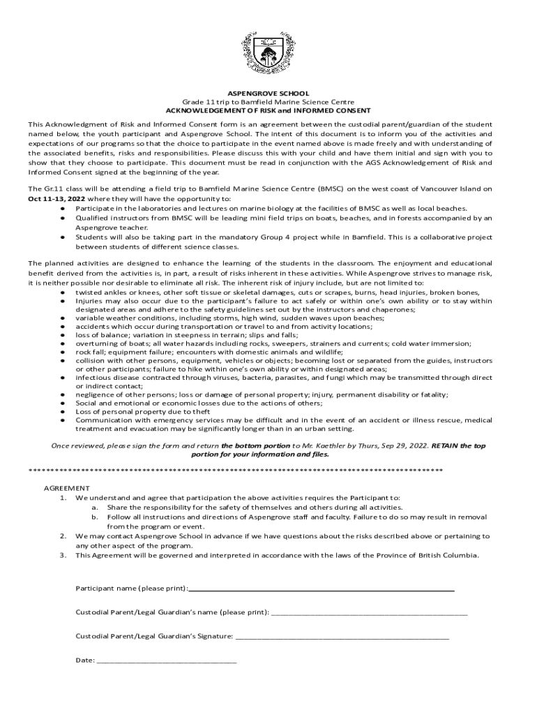ASPENGROVE SCHOOL Grade 11 trip to Garfield Marine Science Center ACKNOWLEDGEMENT OF RISK and INFORMED CONSENT This Acknowledgement of Risk and Informed Consent form is an agreement between the custodial