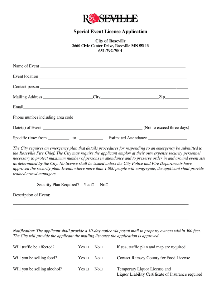 Special Event License Application City of Roseville 2660 Civic Center Drive, Roseville MN 551136517927001Name of Event ___ Event location ___ Contact person ___ Mailing Address ___City___Zip___ Email___