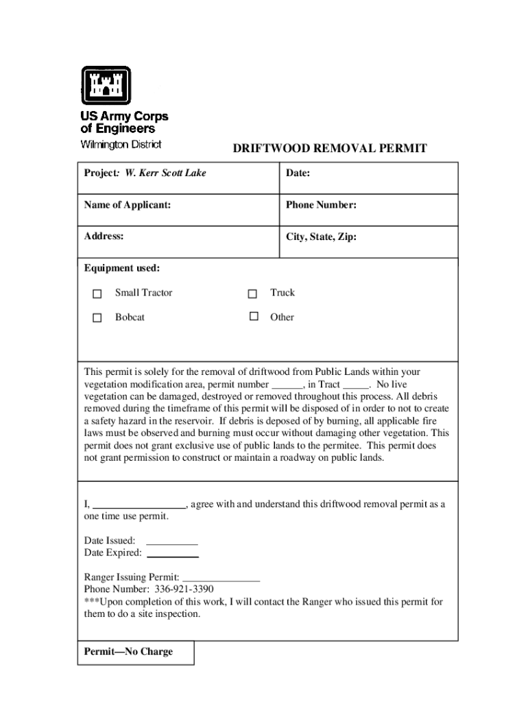 DRIFTWOOD REMOVAL PERMIT Project: W. Kerr Scott Lacerate:Name of Applicant:Phone Number:Address:City, State, Zip:Equipment used: Small TractorTruckBobcatOtherThis permit is solely for the removal