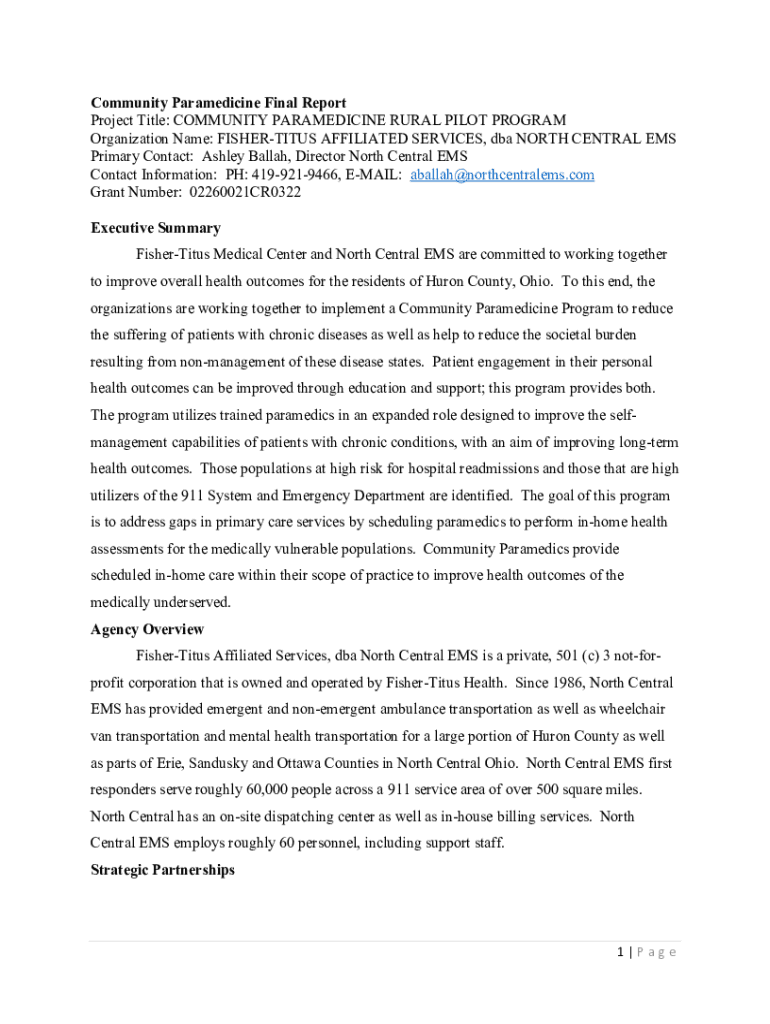 Community Para medicine Final Report Project Title: COMMUNITY PARAMEDIC INE RURAL PILOT PROGRAM Organization Name: FISHERIES AFFILIATED SERVICES, DBA NORTH CENTRAL EMS Primary Contact: Ashley Ballad,
