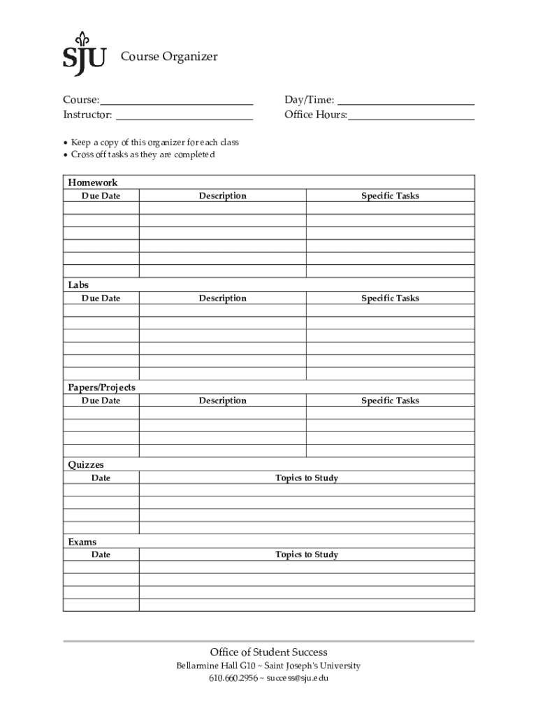 Course Organizer Course: ___ Instructor: ___Day/Time: ___ Office Hours: ___ Keep a copy of this organizer for each class Cross off tasks as they are completedHomework Due DateDescriptionSpecific TasksDescriptionSpecific