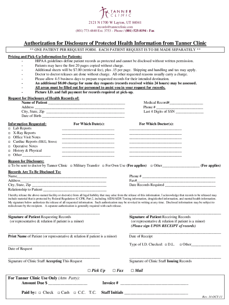 2121 N 1700 W Layton, UT 84041 records@tannerclinic.com (801) 7734840 Ext. 3753 Phone / (801) 5258194 Authorization for Disclosure of Protected Health Information from Tanner Clinic ** ONE PATIENT