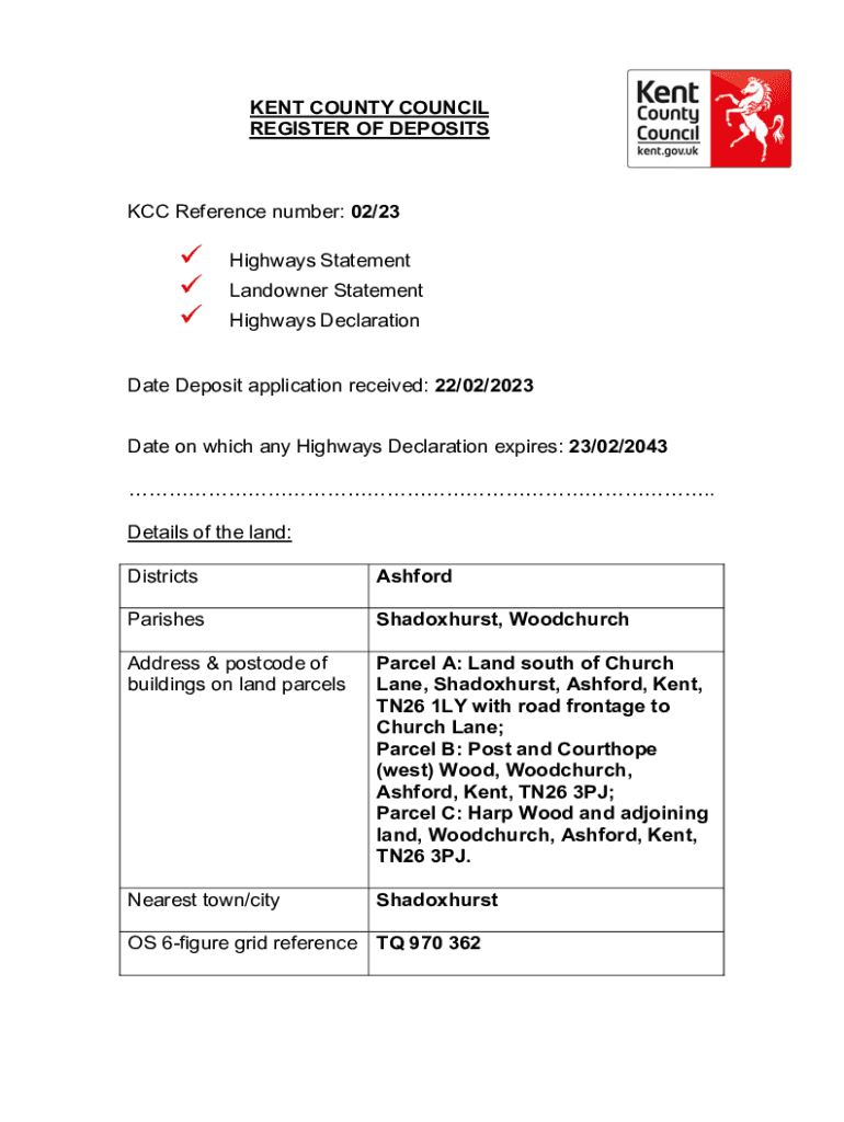 KENT COUNTY COUNCIL REGISTER OF DEPOSITS Reference number: 02/23 Highways Statement Landowner Statement Highways DeclarationDate Deposit application received: 22/02/2023 Date on which any Highways