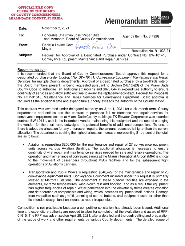 Date:November 2, 2021To:Honorable Chairman Jose Pepe Diaz and Members, Board of County CommissionersFrom:Daniella Levine Cave MayorSubject:Agenda Item No. 8(F)(9)Resolution No. R103321 Request for