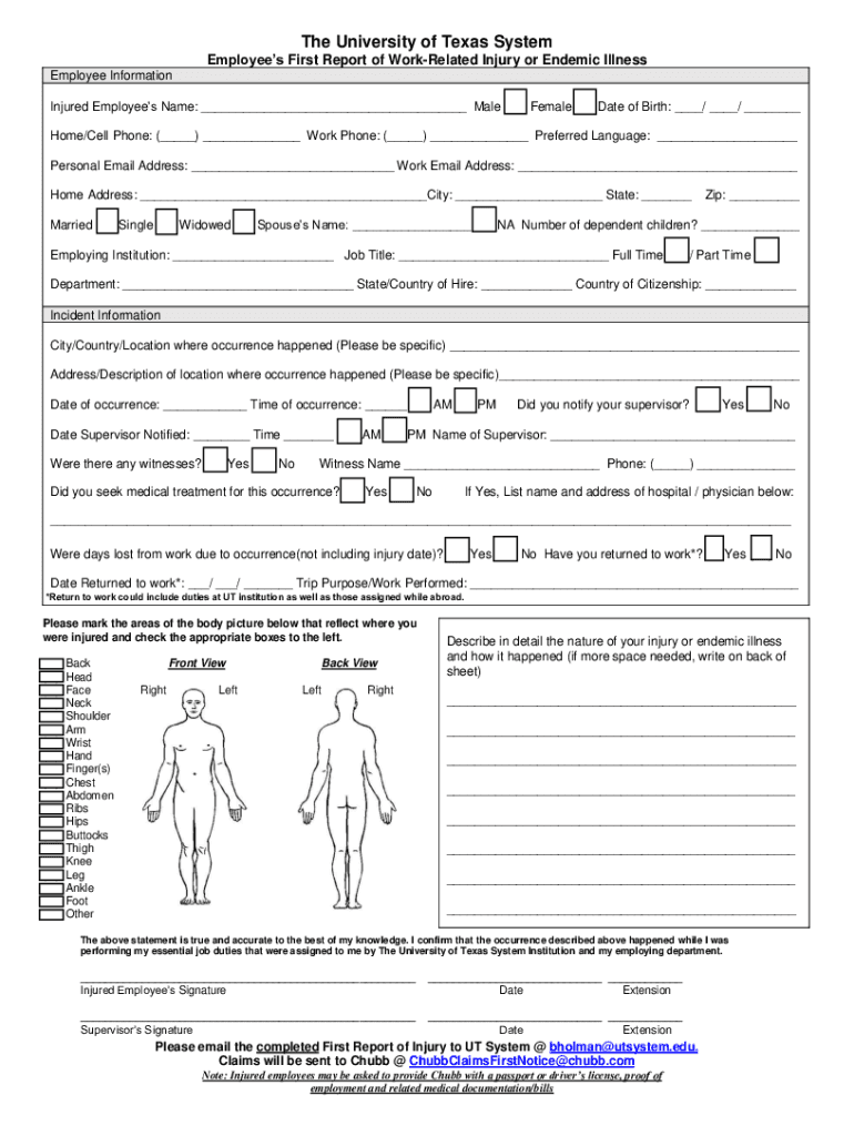 The University of Texas System Employees First Report of Correlated Injury or Endemic Illness Employee Information Injured Employees Name: ___ Male () Female () Date of Birth: ___/ ___/ ___ Home/Cell