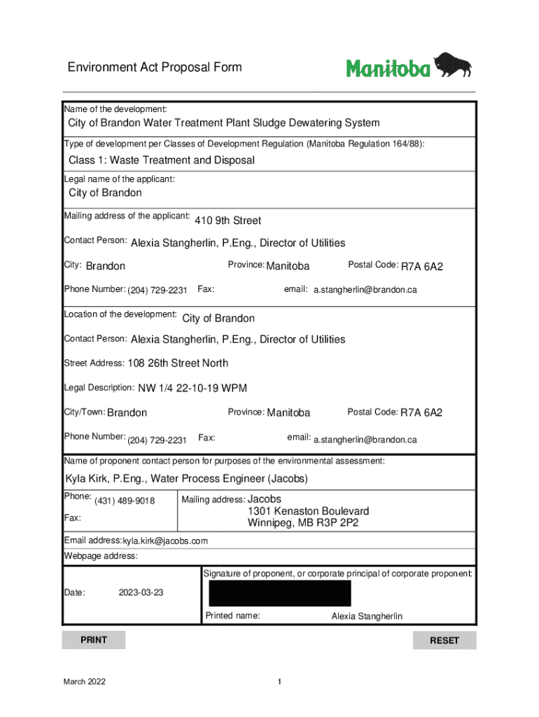 Environment Act Proposal Form Name of the development:City of Brandon Water Treatment Plant Sludge Watering System Type of development per Classes of Development Regulation (Manitoba Regulation 164/88):Class