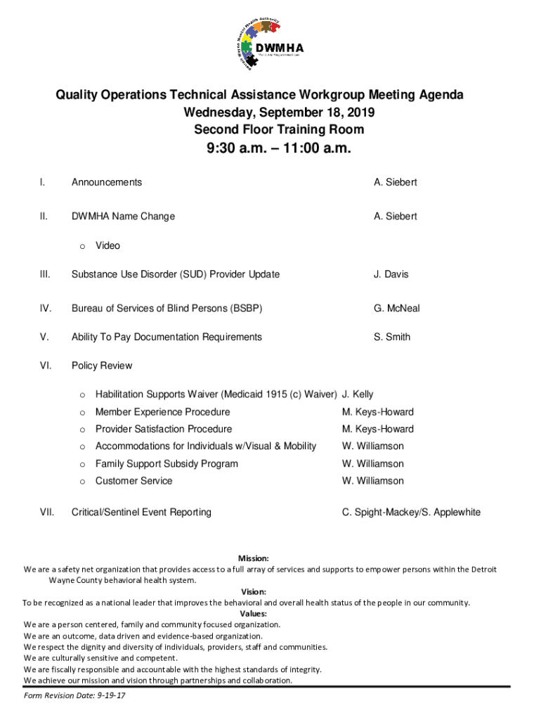 Quality Operations Technical Assistance Workgroup Meeting Agenda