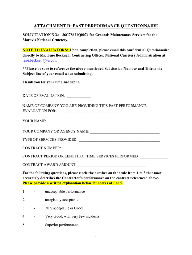 ATTACHMENT D: PAST PERFORMANCE QUESTIONNAIRE SOLICITATION NO.: 36C78621Q0074 for Grounds Maintenance Services for the Morris National Cemetery. NOTE TO EVALUATORS: Upon completion, please email this