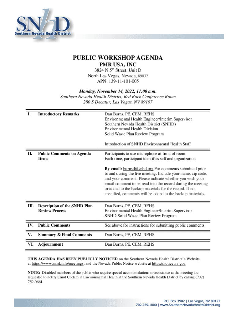 PUBLIC WORKSHOP AGENDA PMR USA, INC 3824 N 5th Street, Unit D North Las Vegas, Nevada, 89032 APN: 13911101005 Monday, November 14, 2022, 11:00 a.m. Southern Nevada Health District, Red Rock Conference