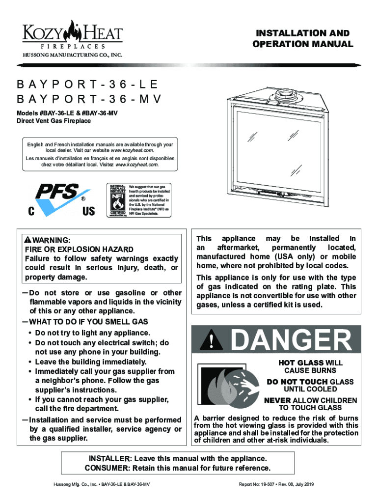 INSTALLATION AND OPERATION MANUAL HUDSON MANUFACTURING CO., INC. B A P O R T 3 6 L E B A P O R T 3 6 M V Models #BAY36LE & #BAY36MV Direct Vent Gas Fireplace English and French installation manuals