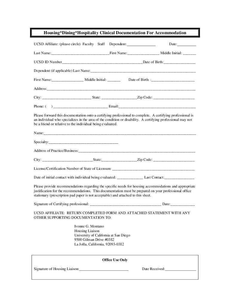 Housing×Dining×Hospitality Clinical Documentation For Accommodation UCSD Affiliate: (please circle) Faculty Self-dependent:Date:Last Name:___First Name:___ Middle Initial: ___ UCSD ID Number___Date