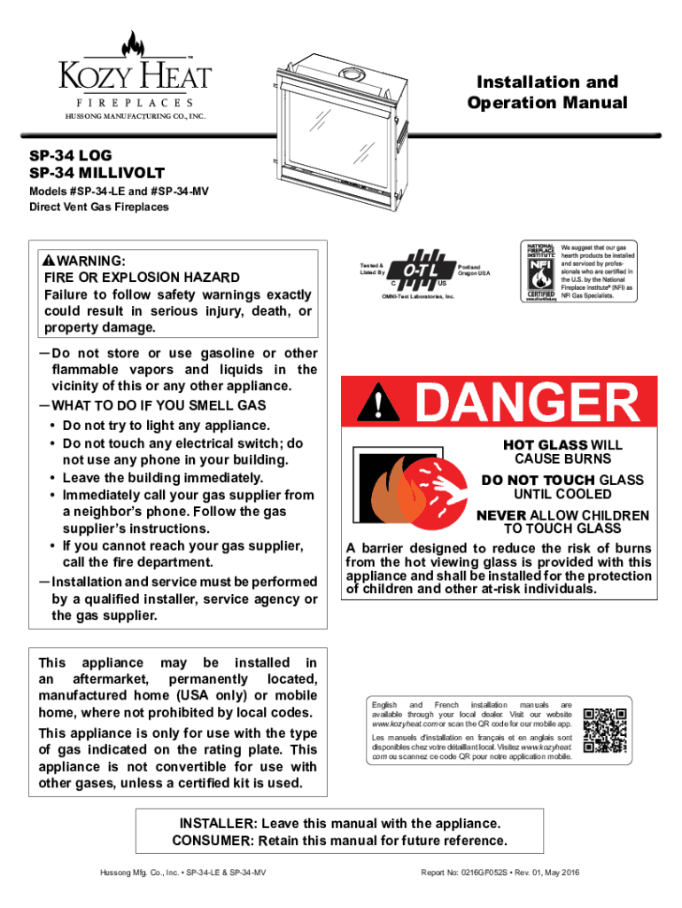 Installation and Operation ManualHUSSONG MANUFACTURING CO., INC.SP34 LOG SP34 MILLIVOLT Models #SP34LE and #SP34MV Direct Vent Gas FireplacesWARNING: FIRE OR EXPLOSION HAZARD Failure to follow safety