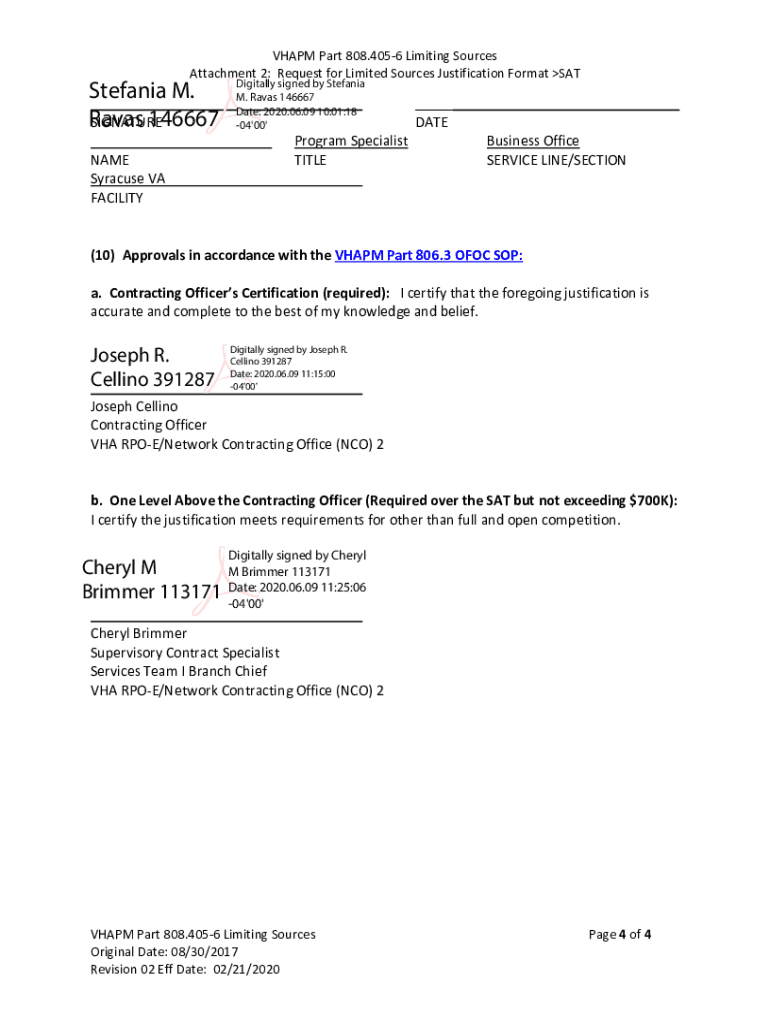 VH APM Part 808.4056 Limiting Sources Attachment 2: Request for Limited Sources Justification Format LIMITED SOURCES JUSTIFICATION ORDER SAT FAR PART 8.4056 Acquisition Plan Action ID: 36C24220AP1813