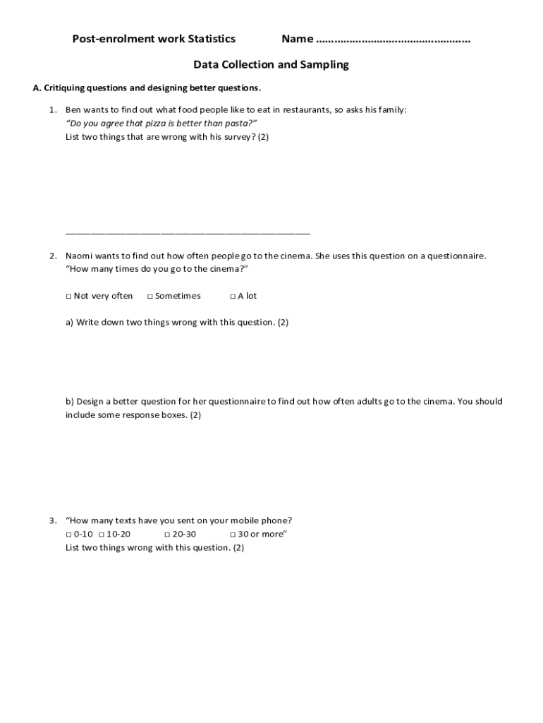 Postenrolment work StatisticsName Data Collection and Sampling A. Critiquing questions and designing better questions. 1. Ben wants to find out what food people like to eat in restaurants, so asks