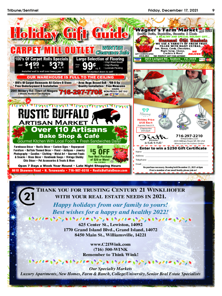 Tribune/Sentinel Friday, December 17, 2021Holiday Gift Guide CARPET MILL OUTLET 100s Of Carpet Rolls Specials Just$1 99 sq. ft.to$3 79 sq. ft. Installed wall-to-wall over heavy painter Clearance SaleWagners