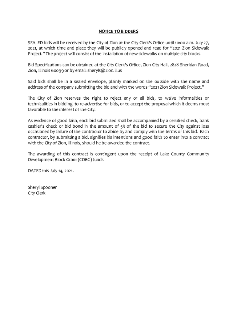 NOTICE TO BIDDERS SEALED bids will be received by the City of Zion at the City Clerk\'s Office until 10:00 a.m. July 27, 2021, at which time and place they will be publicly opened and read for 2021