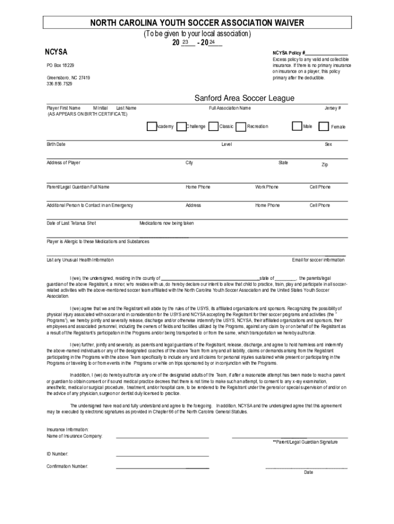 NORTH CAROLINA YOUTH SOCCER ASSOCIATION WAIVER (To be given to your local association) 23 24 20 ___ 20___ NCYSANCYSA Policy # Excess policy to any valid and collectible insurance. If there is no primary