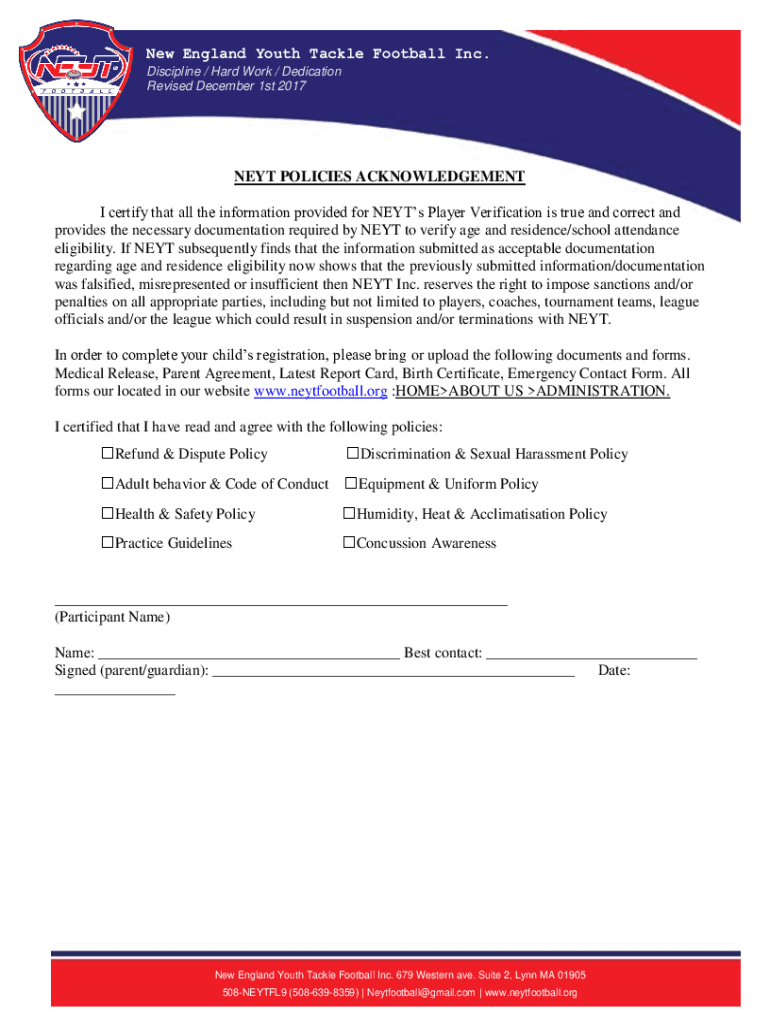 New England Youth Tackle Football Inc. Discipline / Hard Work / Dedication Revised December 1st 2017NEYT POLICIES ACKNOWLEDGEMENT I certify that all the information provided for Nests Player Verification