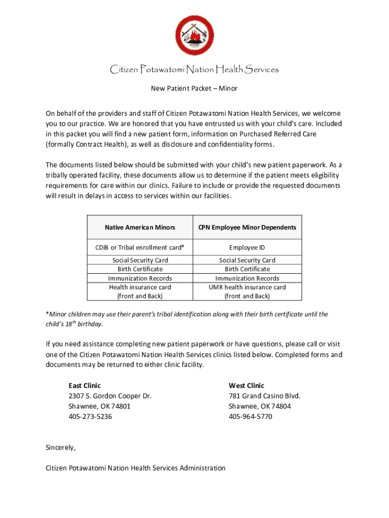 Citizen Pottawatomie Nation Health Services New Patient Packet Minor On behalf of the providers and staff of Citizen Pottawatomie Nation Health Services, we welcome you to our practice. We are honored