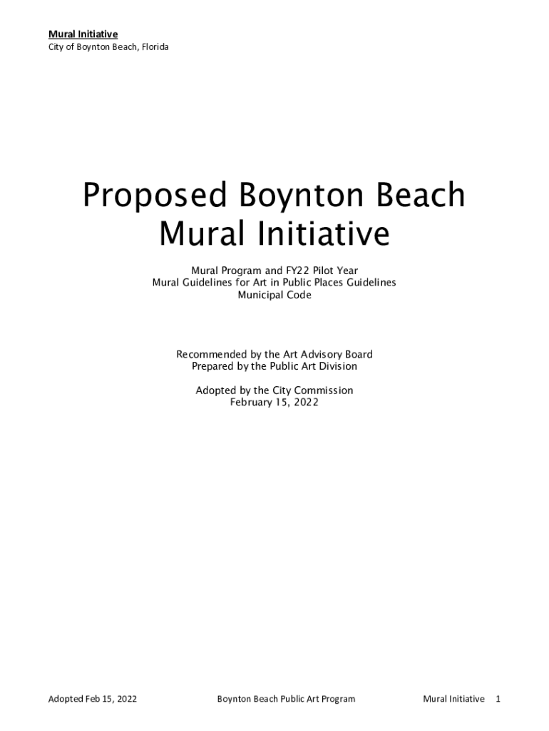 Mural Initiative City of Boynton Beach, FloridaProposed Boynton Beach Mural Initiative Mural Program and FY22 Pilot Year Mural Guidelines for Art in Public Places Guidelines Municipal CodeRecommended