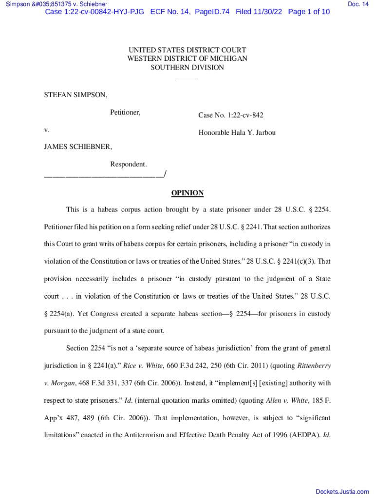 Simpson #851375 v. SchiebnerDoc. 14Case 1:22cv00842HYJPJG ECF No. 14, Paged.74 Filed 11/30/22-Page 1 of 10UNITED STATES DISTRICT COURT WESTERN DISTRICT OF MICHIGAN SOUTHERN DIVISION ___ STEFAN SIMPSON,