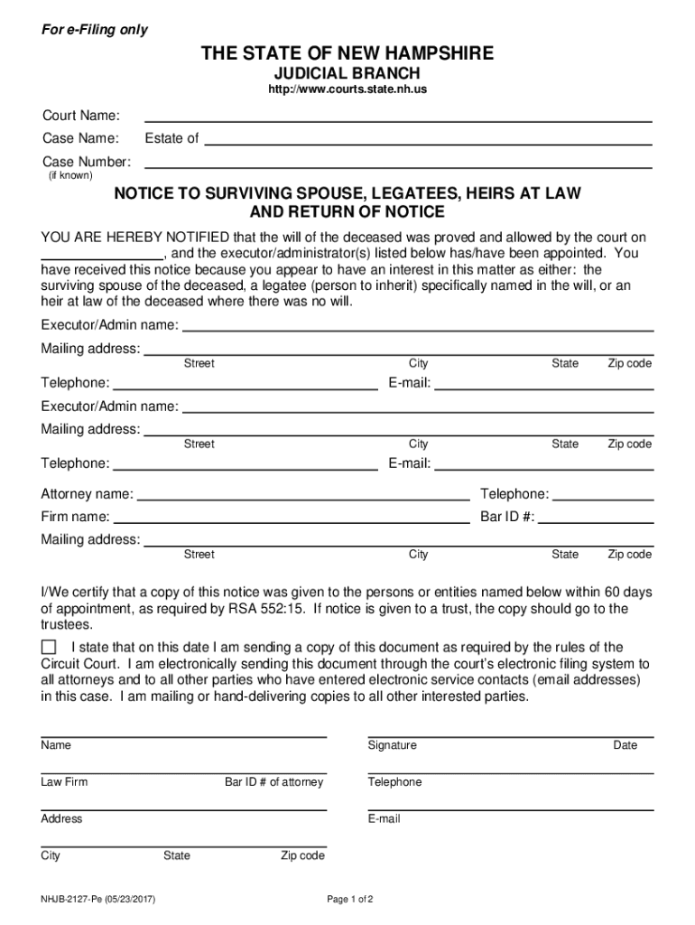 Clear Former filing Blythe STATE OF NEW HAMPSHIRELock & Save Prejudicial BRANCH http://www.courts.state.nh.usCourt Name: Case Name:Estate of Case Number: (if known)NOTICE TO SURVIVING SPOUSE, LEGATEES,
