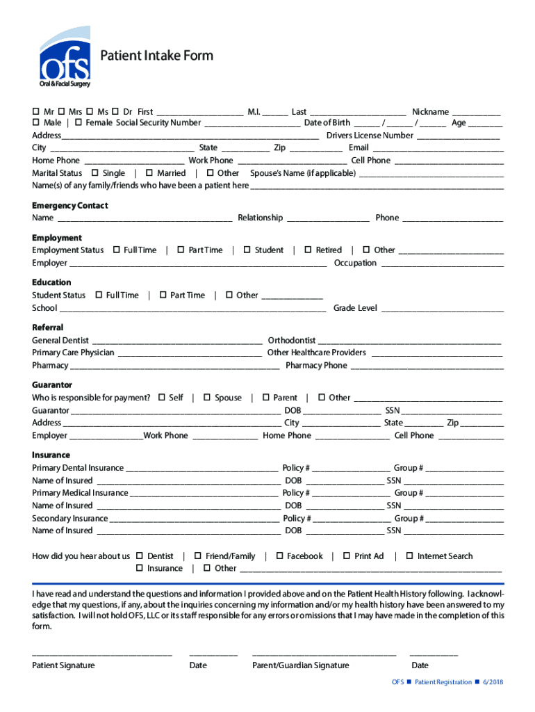 Patient Intake Form Mr Mrs Ms Dr First ___ M.I. ___ Last ___ Nickname ___ Male | Female Social Security Number ___ Date of Birth ___ / ___ / ___ Age ___ Address___ Driver's License Number ___ City