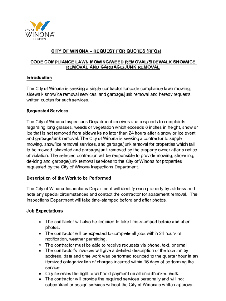 CITY OF WINONA REQUEST FOR QUOTES (RFCs) CODE COMPLIANCE LAWN MOWING/WEED REMOVAL/SIDEWALK SNOW/ICE REMOVAL AND GARBAGE/JUNK REMOVAL Introduction The City of Winona is seeking a single contractor