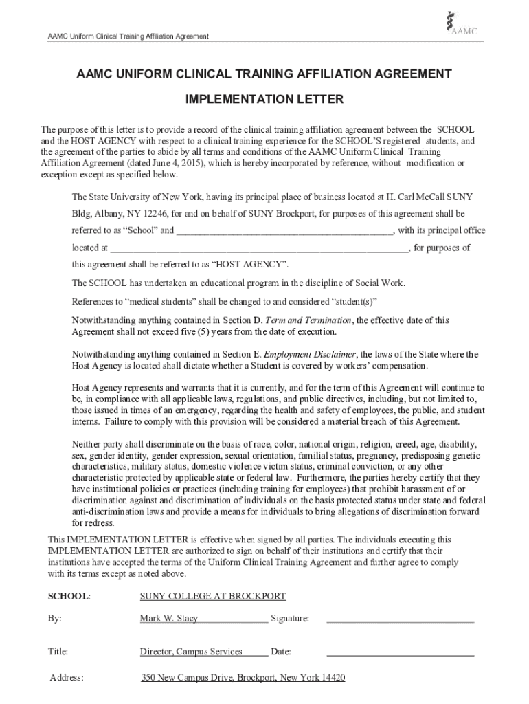 AAMC Uniform Clinical Training Affiliation AgreementAAMC UNIFORM CLINICAL TRAINING AFFILIATION AGREEMENT IMPLEMENTATION LETTER The purpose of this letter is to provide a record of the clinical training