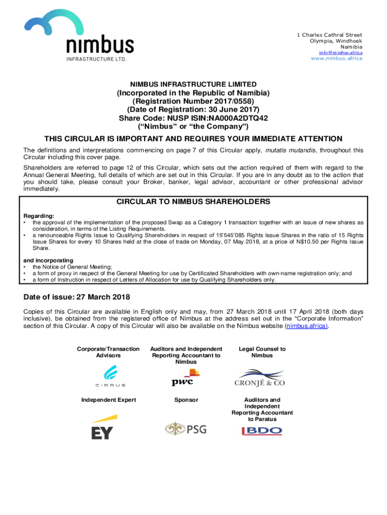 1 Charles Natural Street Olympia, Windhoek Namibia info@nimbus.africa www.nimbus.africaNIMBUS INFRASTRUCTURE LIMITED(Incorporated in the Republic of Namibia) (Registration Number 2017/0558) (Date