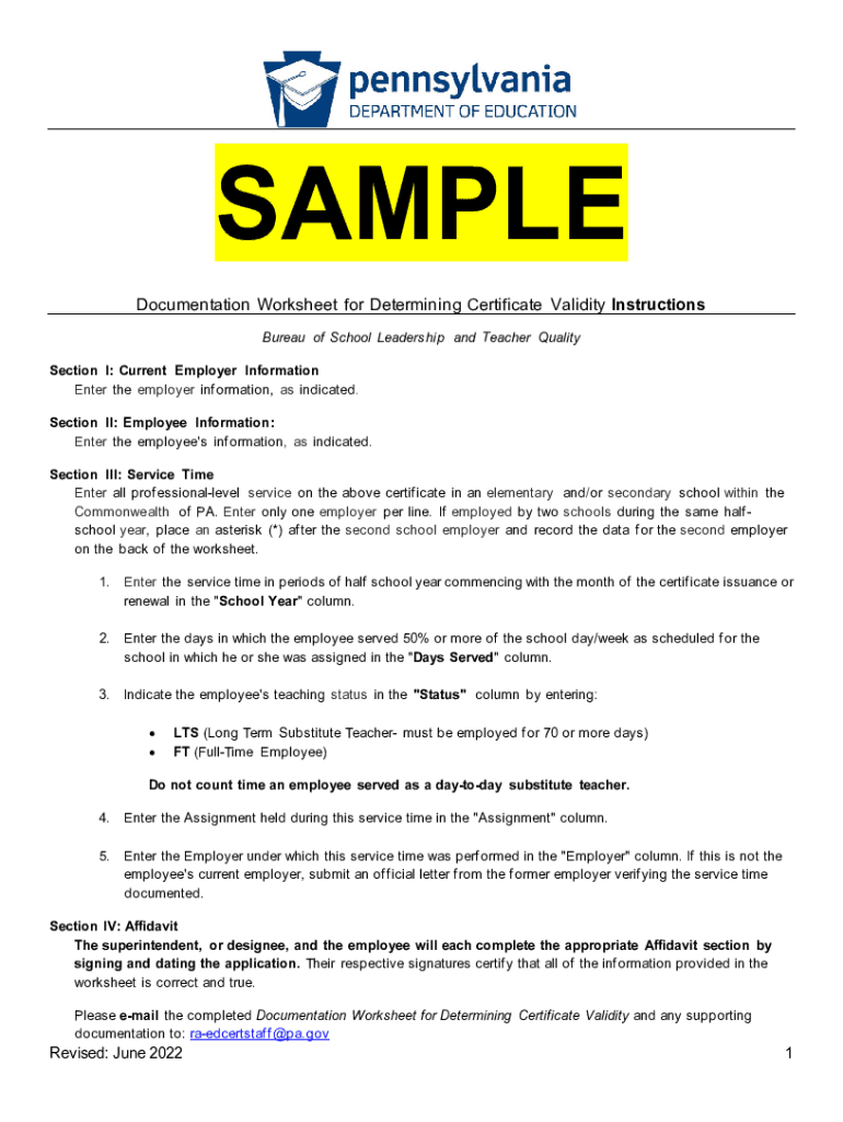 SAMPLE Documentation Worksheet for Determining Certificate Validity Instructions Bureau of School Leaders hip and Teacher Quality Section I: Current Employer Information Enter the employer in formation,