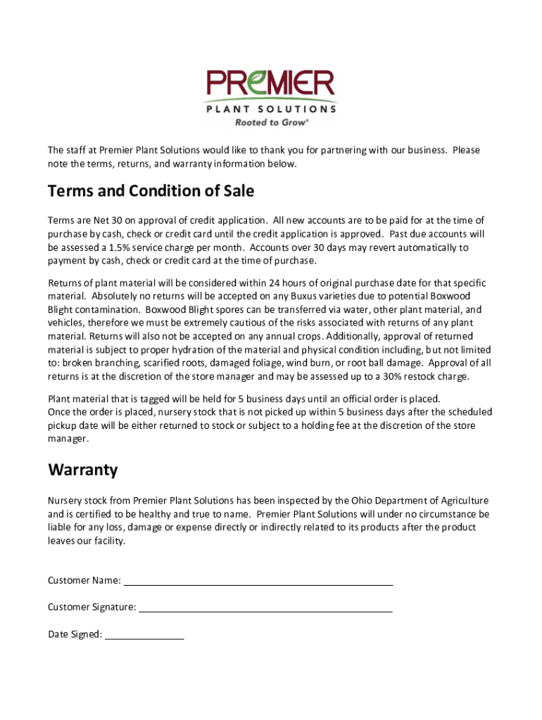 The staff at Premier Plant Solutions would like to thank you for partnering with our business. Please note the terms, returns, and warranty information below. Terms and Condition of Sale Terms are