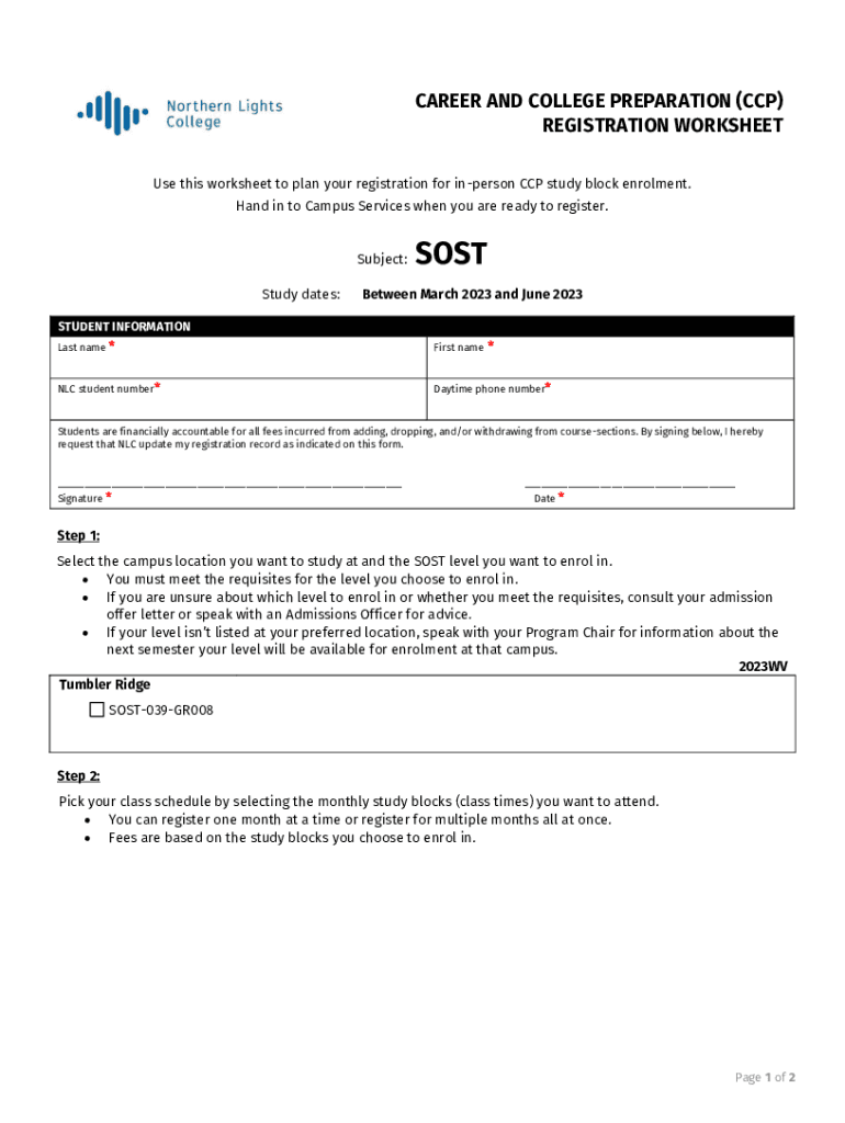 CAREER AND COLLEGE PREPARATION (CCP) REGISTRATION WORKSHEET Use this worksheet to plan your registration for unperson CCP study block enrollment. Hand in to Campus Services when you are ready to register.