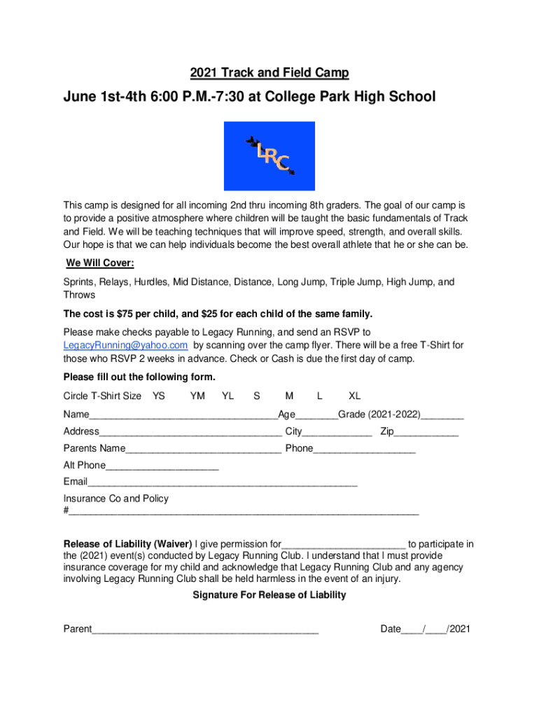 2021 Track and Field Camp June 1st4th 6:00 P.M.7:30 at College Park High Schools camp is designed for all incoming 2nd through incoming 8th graders. The goal of our camp is to provide a positive atmosphere