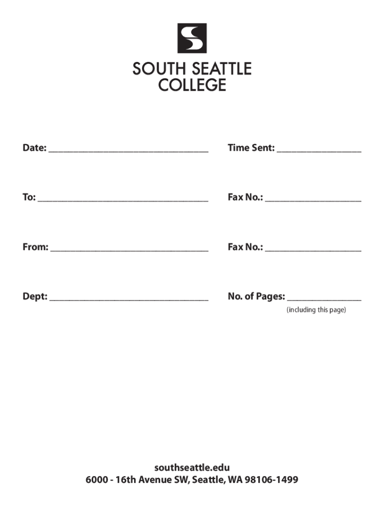 Date: ___Time Sent: ___To: ___Fax No.: ___From: ___Fax No.: ___Dept: ___No. Of Pages: ___ (including this page)southseattle.edu 6000 16th Avenue SW, Seattle, WA 981061499