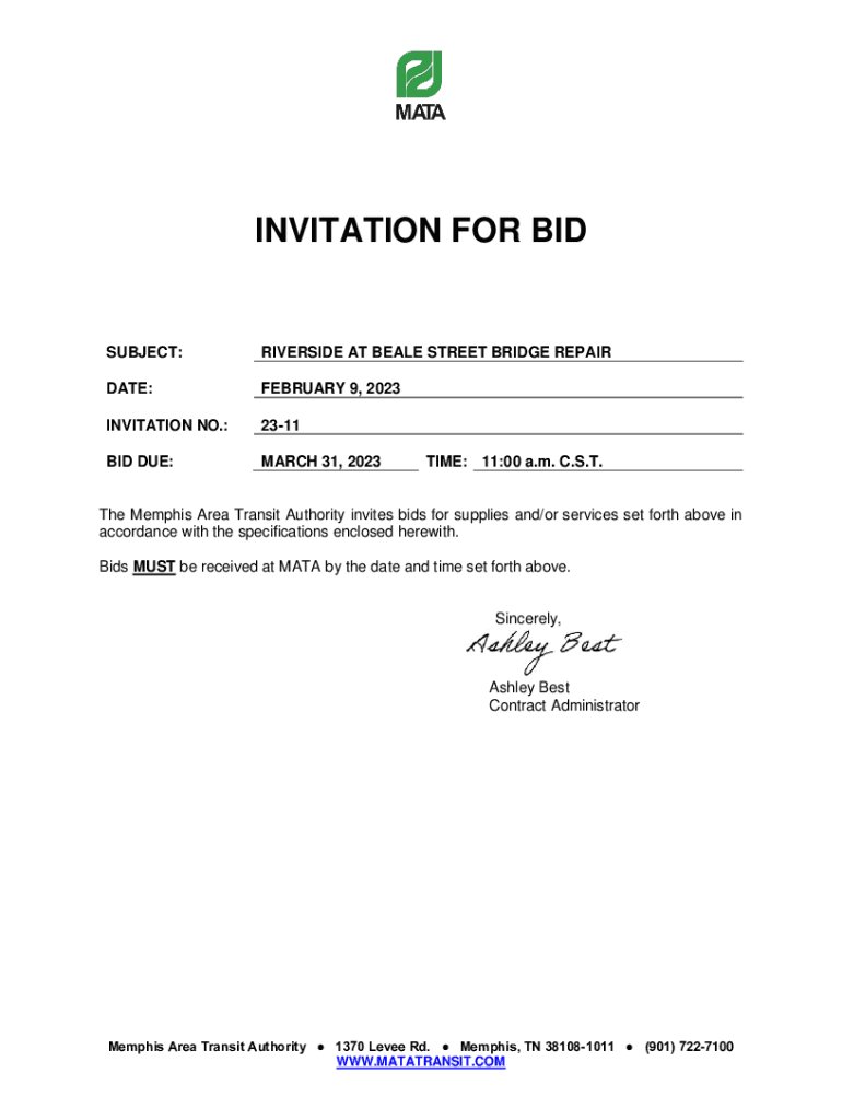 INVITATION FOR SUBJECT:RIVERSIDE AT BEALE STREET BRIDGE REPATRIATE:FEBRUARY 9, 2023INVITATION NO.:2311BID DUE:MARCH 31, 2023TIME: 11:00 a.m. C.S.T. The Memphis Area Transit Authority invites bids