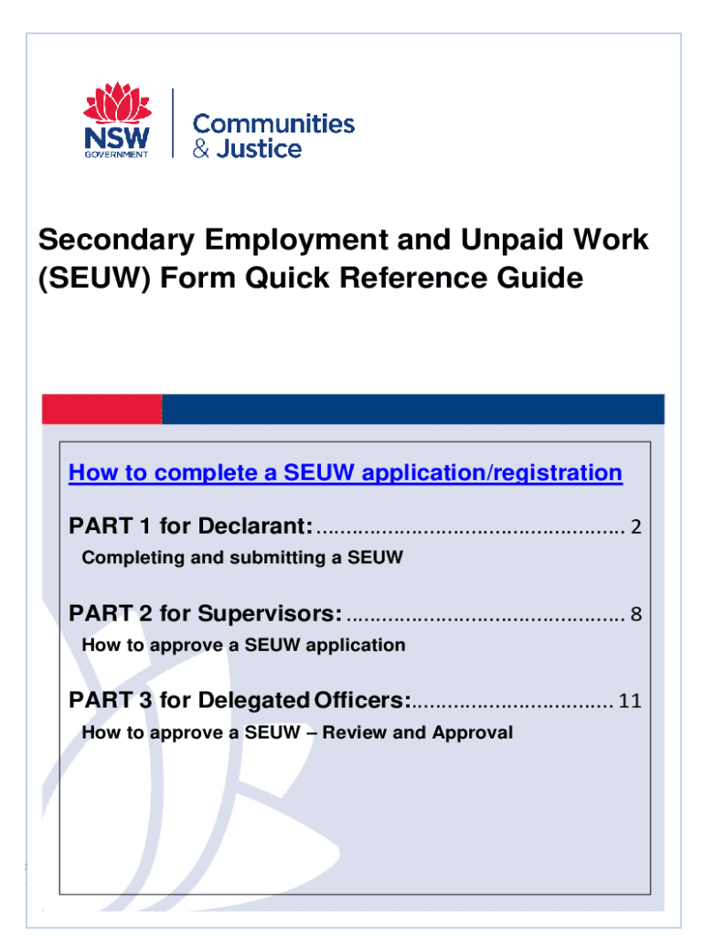 Secondary Employment and Unpaid Work (Pages 24) (SEW) Form Quick Reference Guide (Pages 57)(Pages 810)How to complete a SEW application/registration PART 1 for Declaring: ....................................................